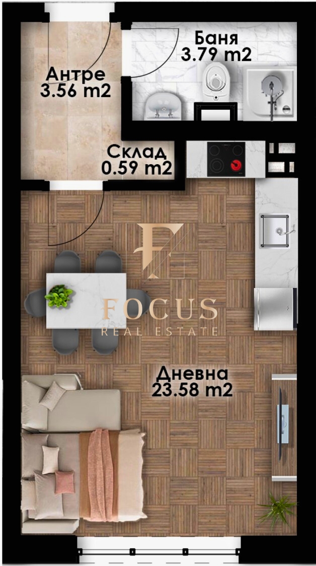 Организация Фокус представя едностаен апартамент в новостроящ се жилищен комплекс в квартал Беломорски, град Пловдив!