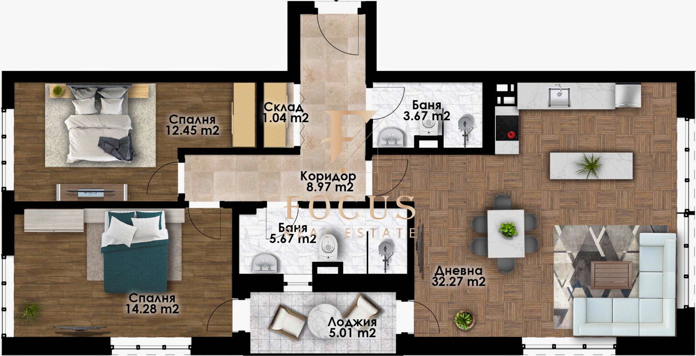 Апартаментът е с обща площ от 129,01 кв.м. със следното разпределение: антре, дневна с кухненски бокс, две спални, две бани с тоалетни, склад и тераса.