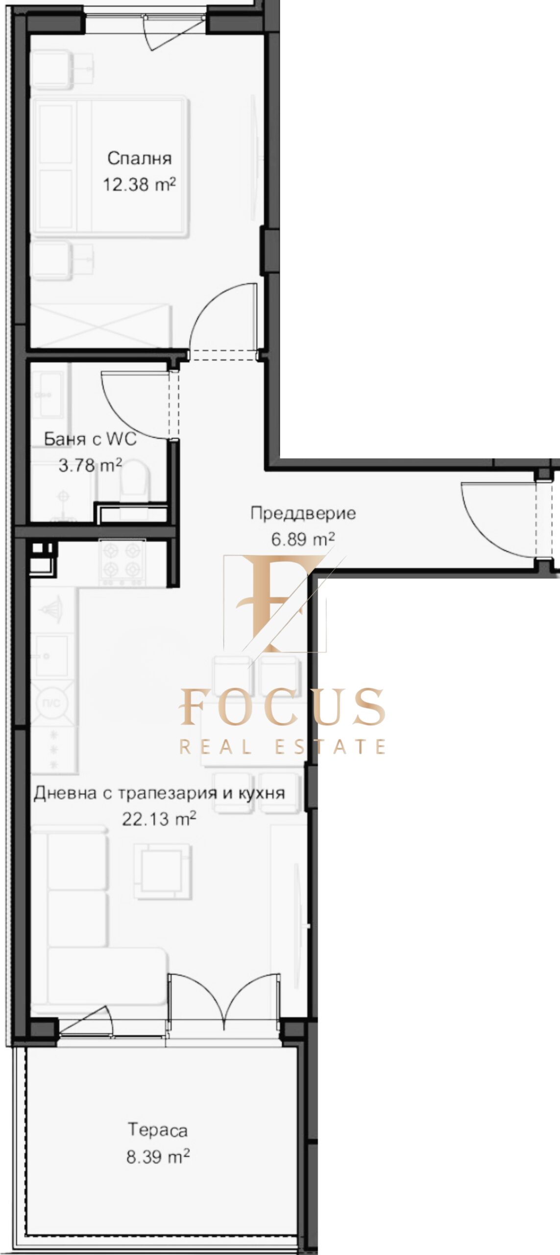 Разпределение: антре, дневна с кухненски бокс, спалня, баня с тоалетна и тераса.