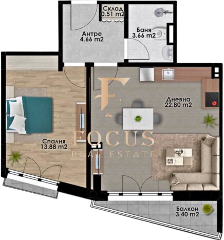 Разпределение: антре, дневна с кухненски бокс, спалня, баня с тоалетна, склад и балкон.