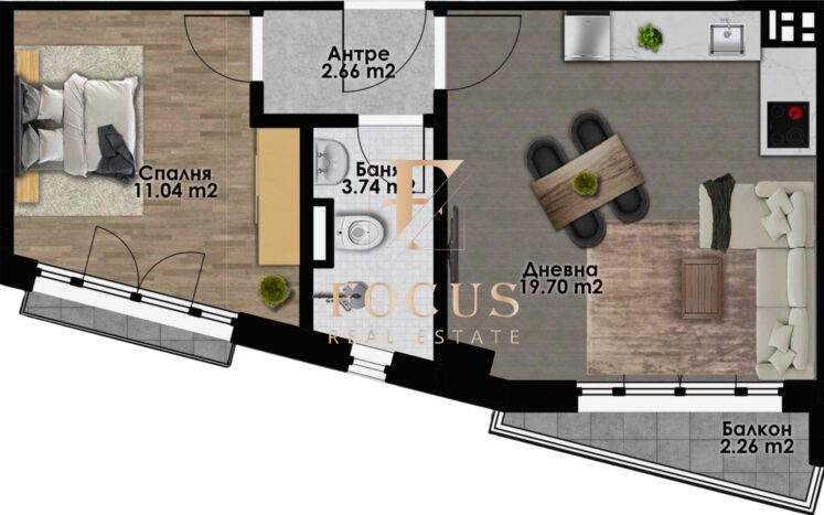 Разпределение: антре, дневна с кухненски бокс, спалня, баня с тоалетна и балкон.