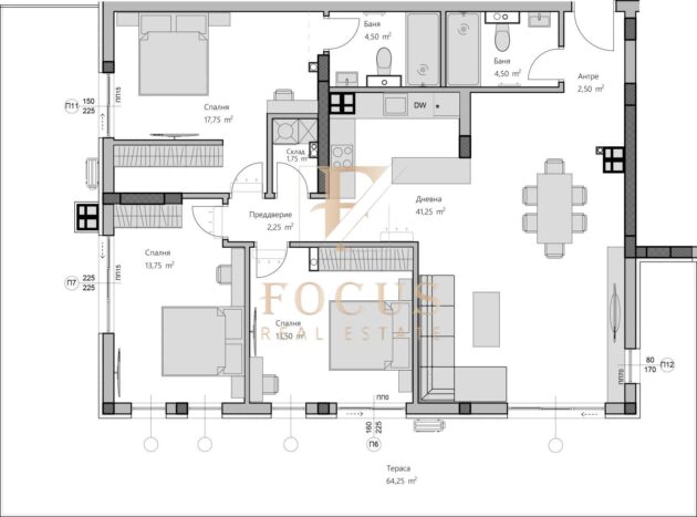 Апартаментът е с обща площ от 199,35 кв.м. със следното разпределение: антре, хол с кухненски бокс, три спални, две бани с тоалетни, склад и тераса – 64,25 кв.м.