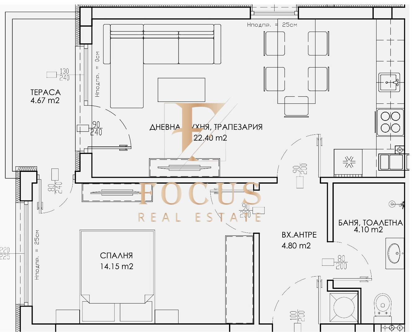 Апартаментът е с обща площ от 65,48 кв.м. със следното разпределение: антре, дневна с кухненски бокс, спалня, баня с тоалетна и тераса.