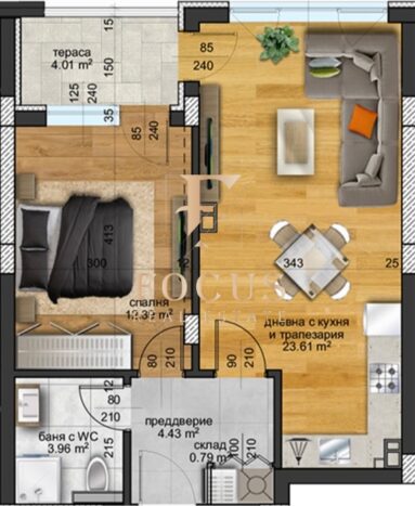 Апартаментът е 64,70 кв.м. със следното разпределение: коридор, дневна с кухненски бокс, спалня, баня с тоалетна, склад и тераса.