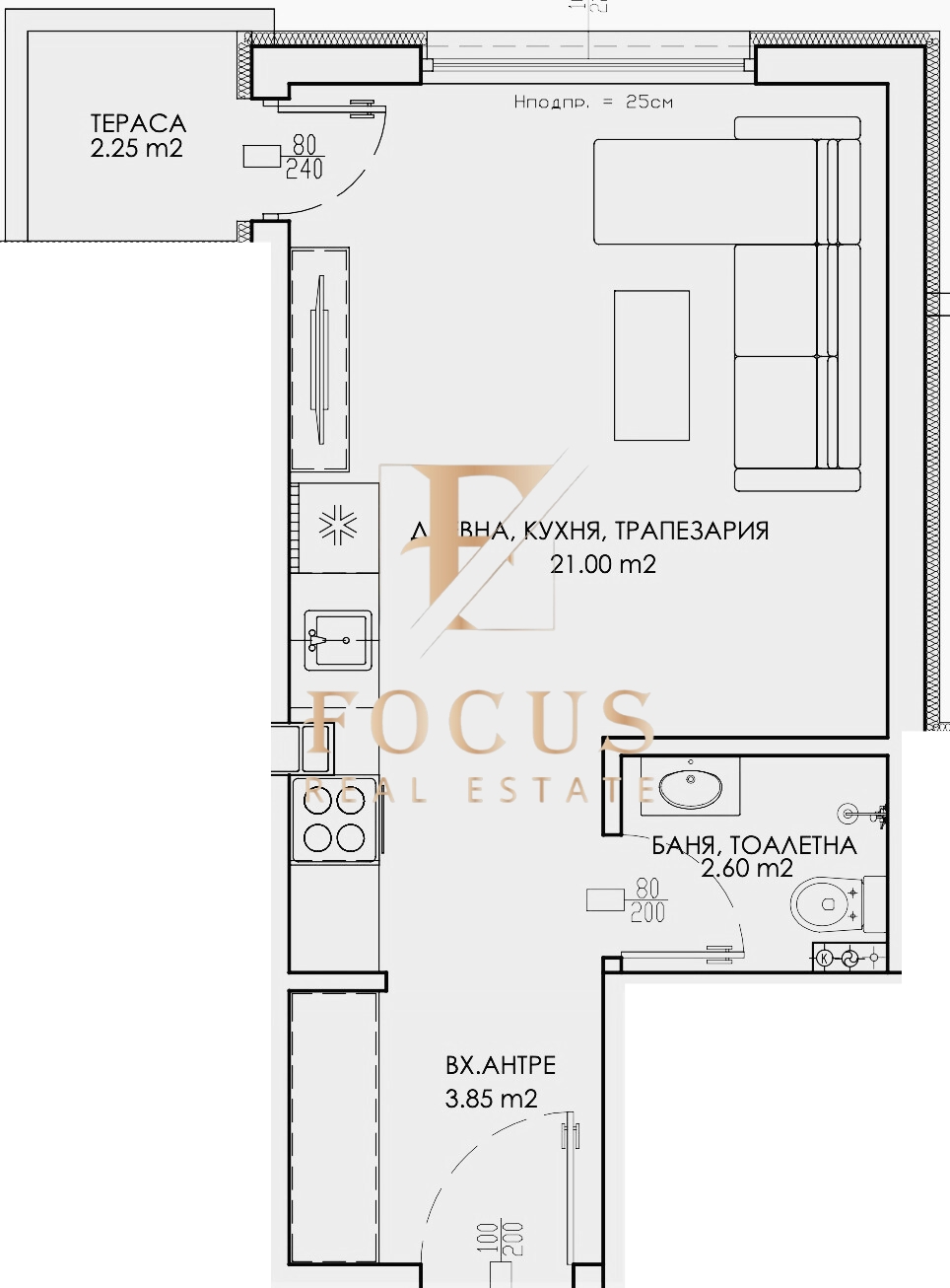 Апартаментът е с обща площ от 39,81 кв.м. със следното разпределение: антре, дневна с кухненски бокс, баня с тоалетна и тераса.