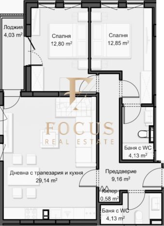 Апартаментът е с обща площ от 113,13 кв.м. със следното разпределение: антре, хол с кухненски бокс, две спални, килер, две бани с тоалетни и тераса.