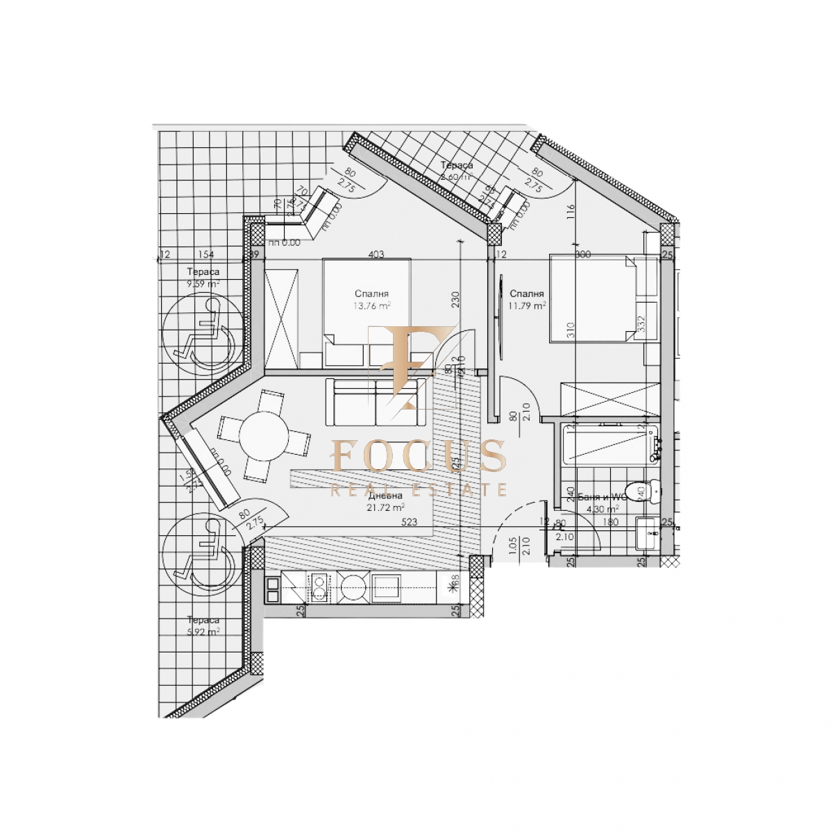 Апартаментът е с обща площ от 97,11 кв.м. със следното разпределение: антре, хол с кухненски бокс, две спални, баня с тоалетна и две тераси.