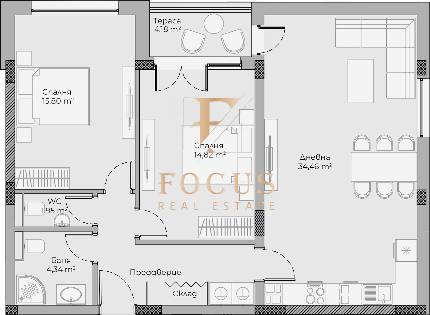 Апартаментът е с обща площ от 110,16 кв.м. със следното разпределение: антре, хол с кухненски бокс, две спални, баня с тоалетна, отделна тоалетна, склад и тераса.