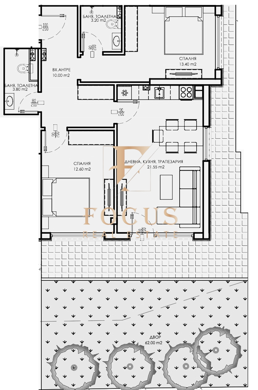 Апартаментът е с обща площ от 84,69 кв.м. със следното разпределение: антре, дневна с кухненски бокс, две спални, две бани с тоалетни и двор – 62 кв.м.
