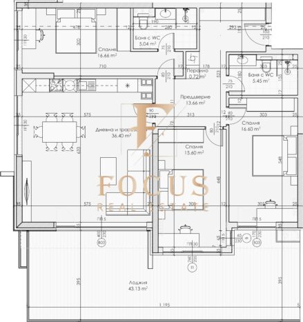Апартаментът е с обща площ от 203,23 кв.м. със следното разпределение: антре, хол с кухненски бокс, три спални, две бани с тоалетни и тераса – 43,13 кв.м.