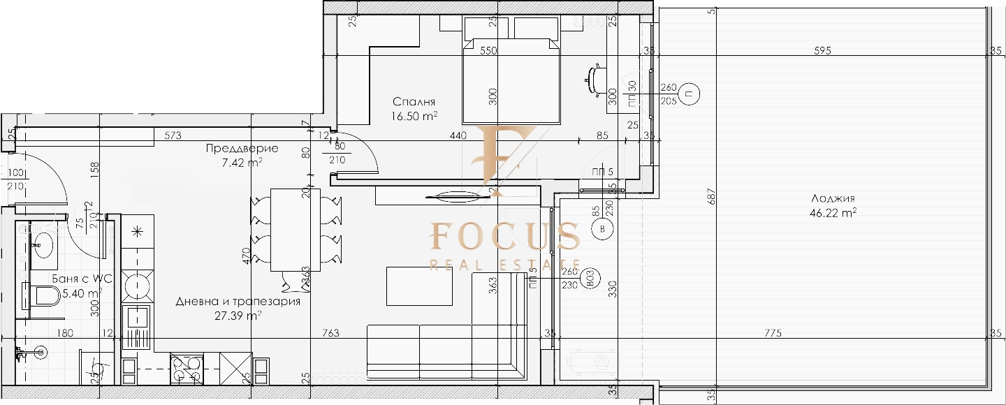 Апартаментът е с обща площ от 130,95 кв.м. със следното разпределение: антре, хол с кухненски бокс, спалня, баня с тоалетна и тераса – 46,22 кв.м.