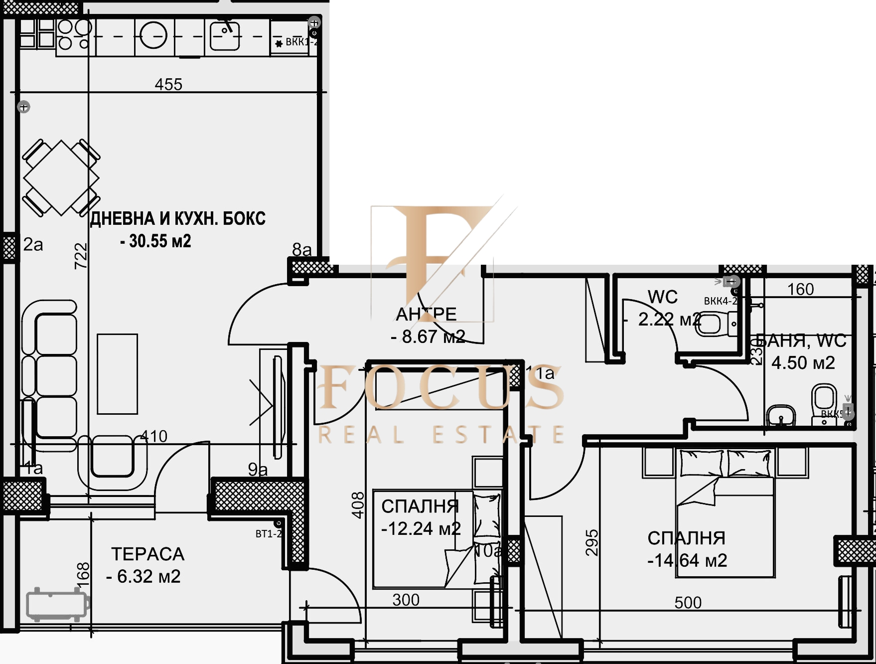 Апартаментът е с обща площ от 111,41 кв.м. със следното разпределение: антре, хол с кухненски бокс, две спални, баня с тоалетна, отделна тоалетна и тераса.