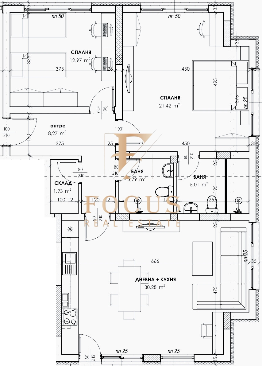 Апартаментът е с обща площ от 109,61 кв.м. със следното разпределение: антре, дневна с кухненски бокс, две спални, две бани с тоалетни и склад. Към имота има веранда – 29 кв.м. и двор – 49,60 кв.м.