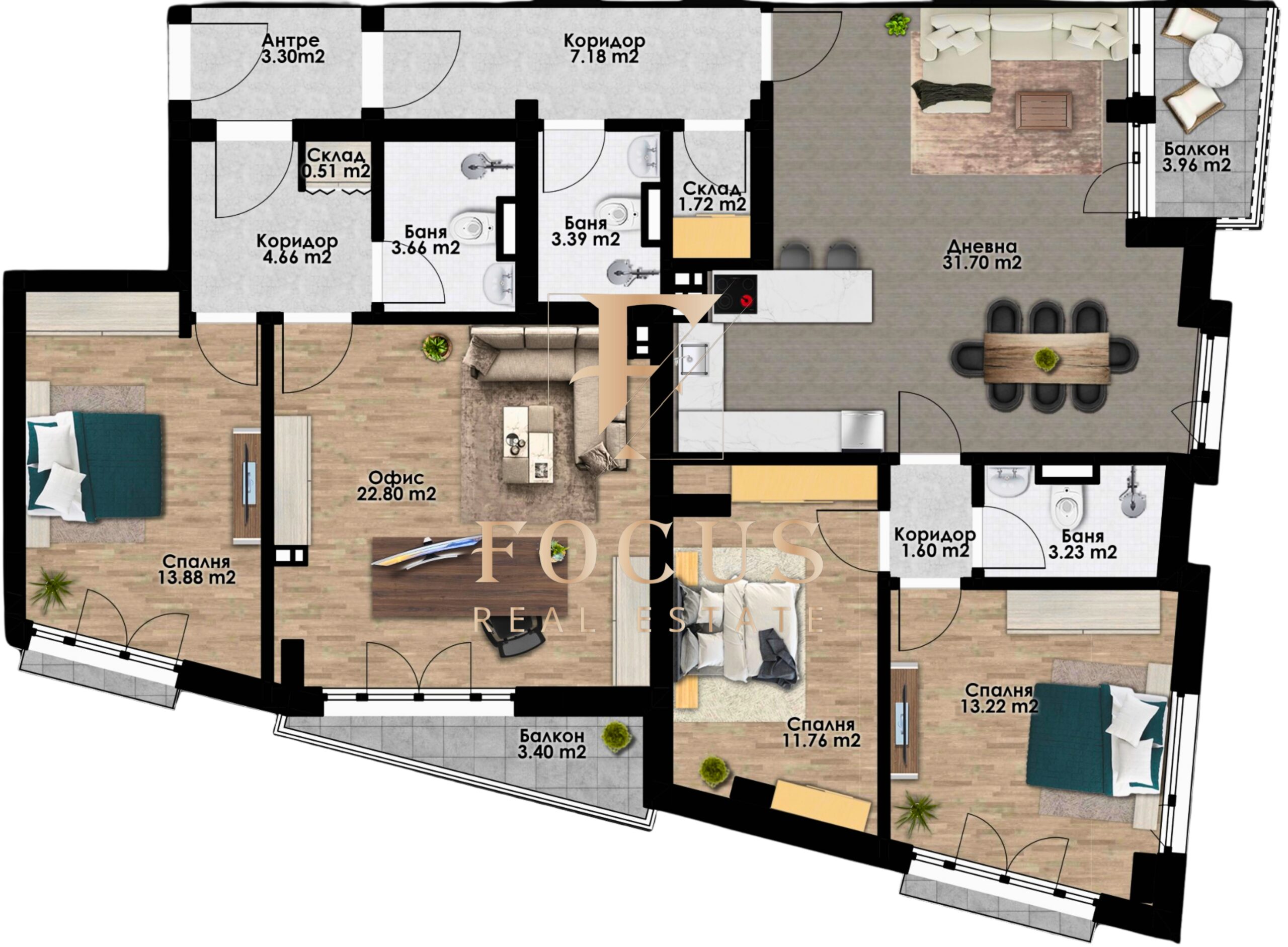 Разпределение: антре, коридори, дневна с кухненски бокс, три спални, голям офис, три бани с тоалетни, два склада и два балкона.