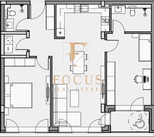 Разпределение: антре, дневна с кухненски бокс, две спални, две бани с тоалетни, мокро помещение и тераса.
