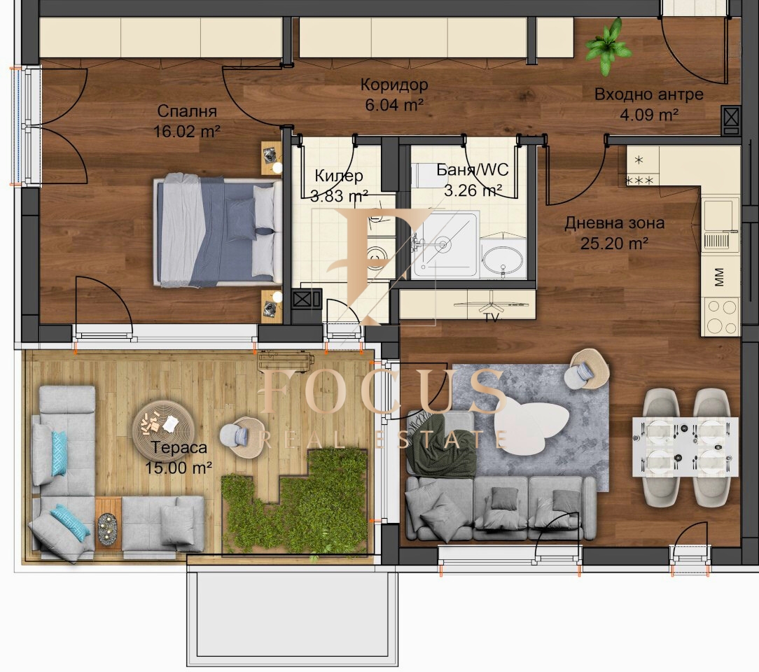 Апартаментът е с обща площ от 108,62 кв.м. със следното разпределение: антре, хол с кухненски бокс, спалня, баня с тоалетна, килер и тераса – 15,00 кв.м.