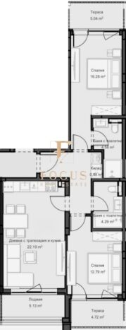 Апартаментът е с обща площ от 107.59 кв.м. със следното разпределение: антре, дневна с кухненски бокс, две спални, две бани с тоалетни, килер и три тераси.