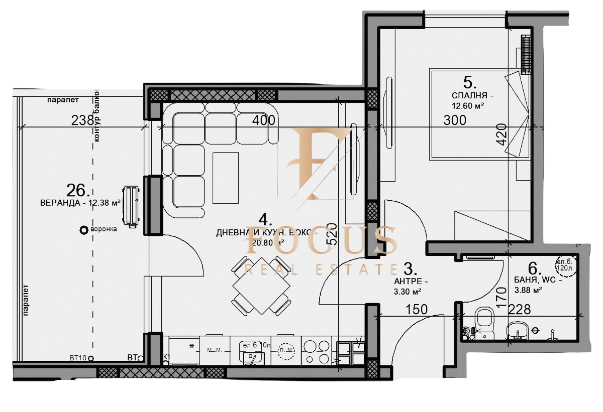 Апартаментът е с обща площ от 77,24 кв.м. със следното разпределение: антре, хол с кухненски бокс, спалня, склад и баня с тоалетна. Към апартамента има покрита веранда – 12,38 кв.м.