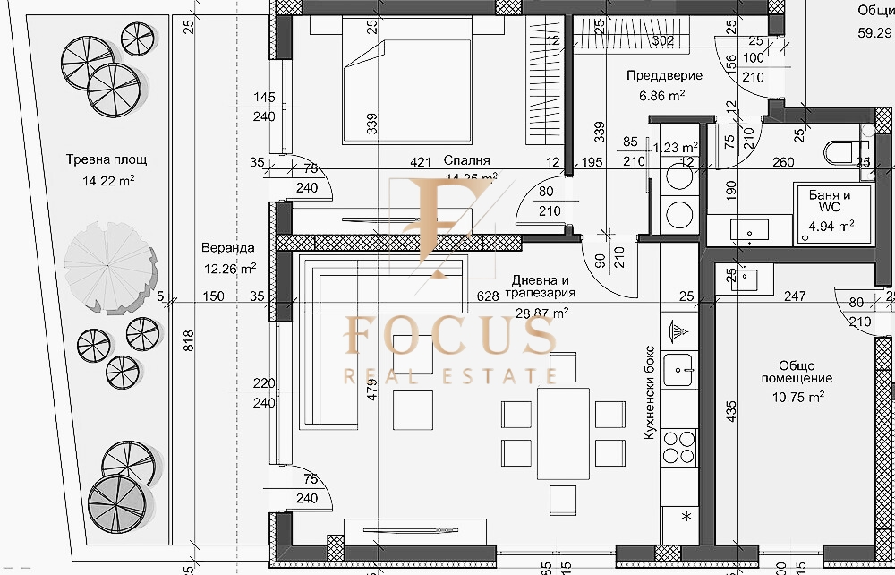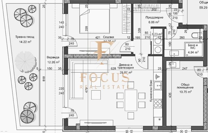 преддверие , дневна с трапезария и кухненски бокс, спалня, баня с тоалетна, веранда – 12,26 кв.м и прилежаща тревна площ – 14,22 кв.м.
