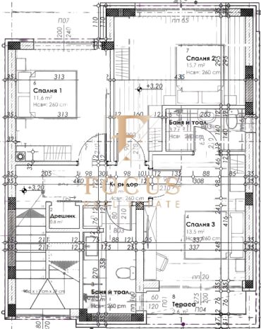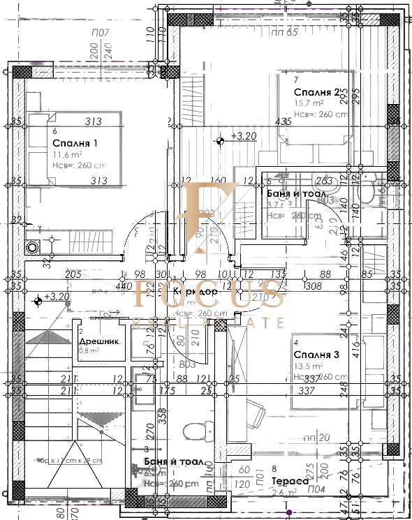 2-ри етаж: три самостоятелни спални, две бани с тоалетни, дрешник и тераса.