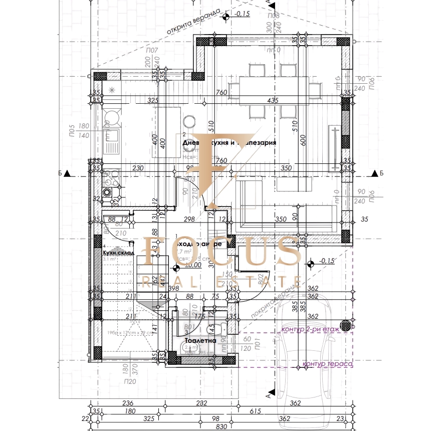 1-ви етаж: входно антре, просторна дневна с кухненски бокс и излаз към веранда и дворно пространство, тоалетна и складово помещение.