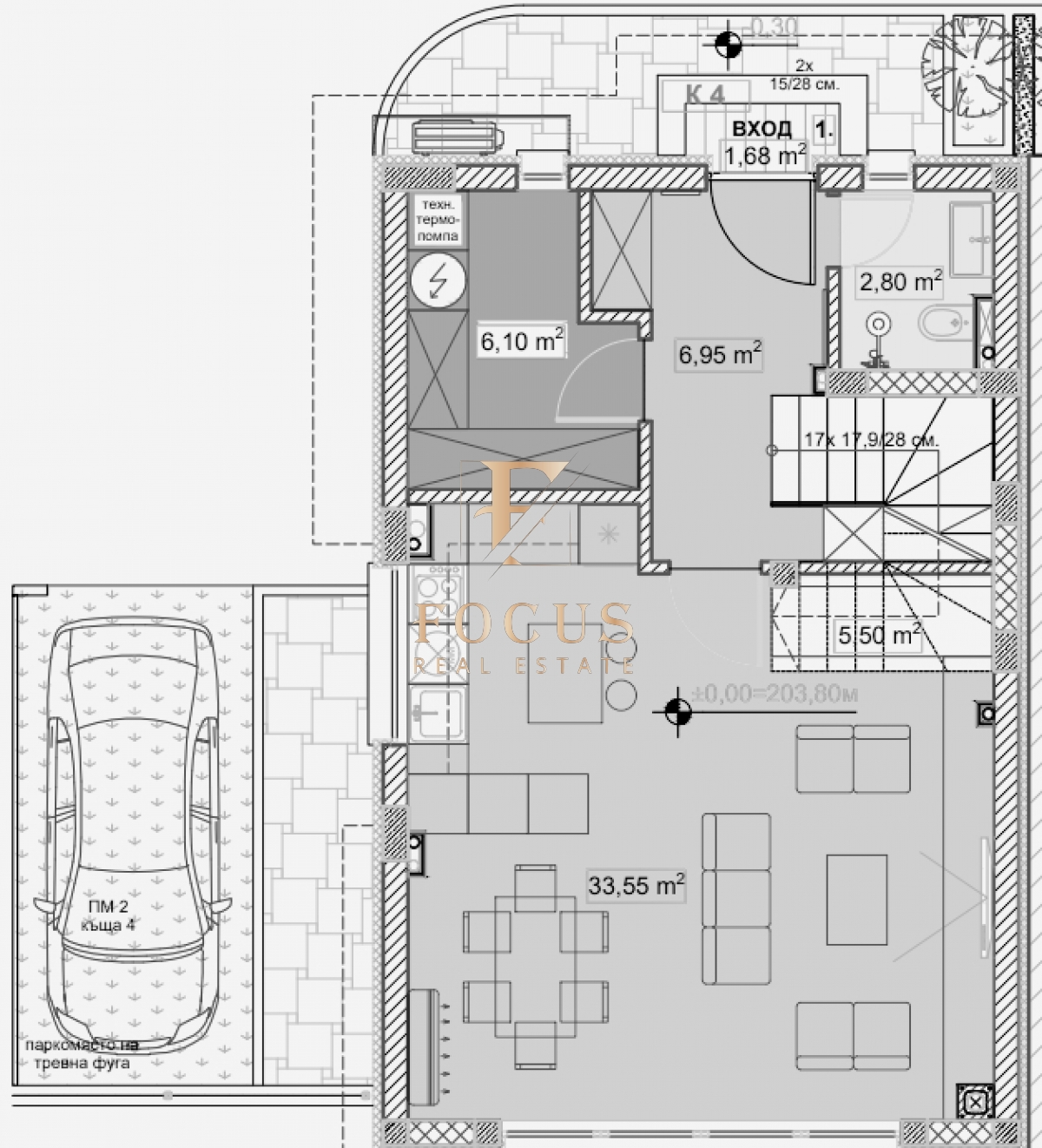 Имотът разполага със собствен двор и две паркоместа, осигуряващи удобство и спокойствие за живущите.