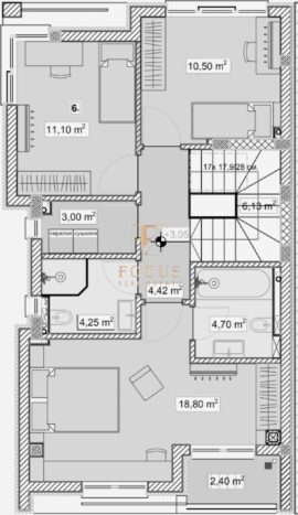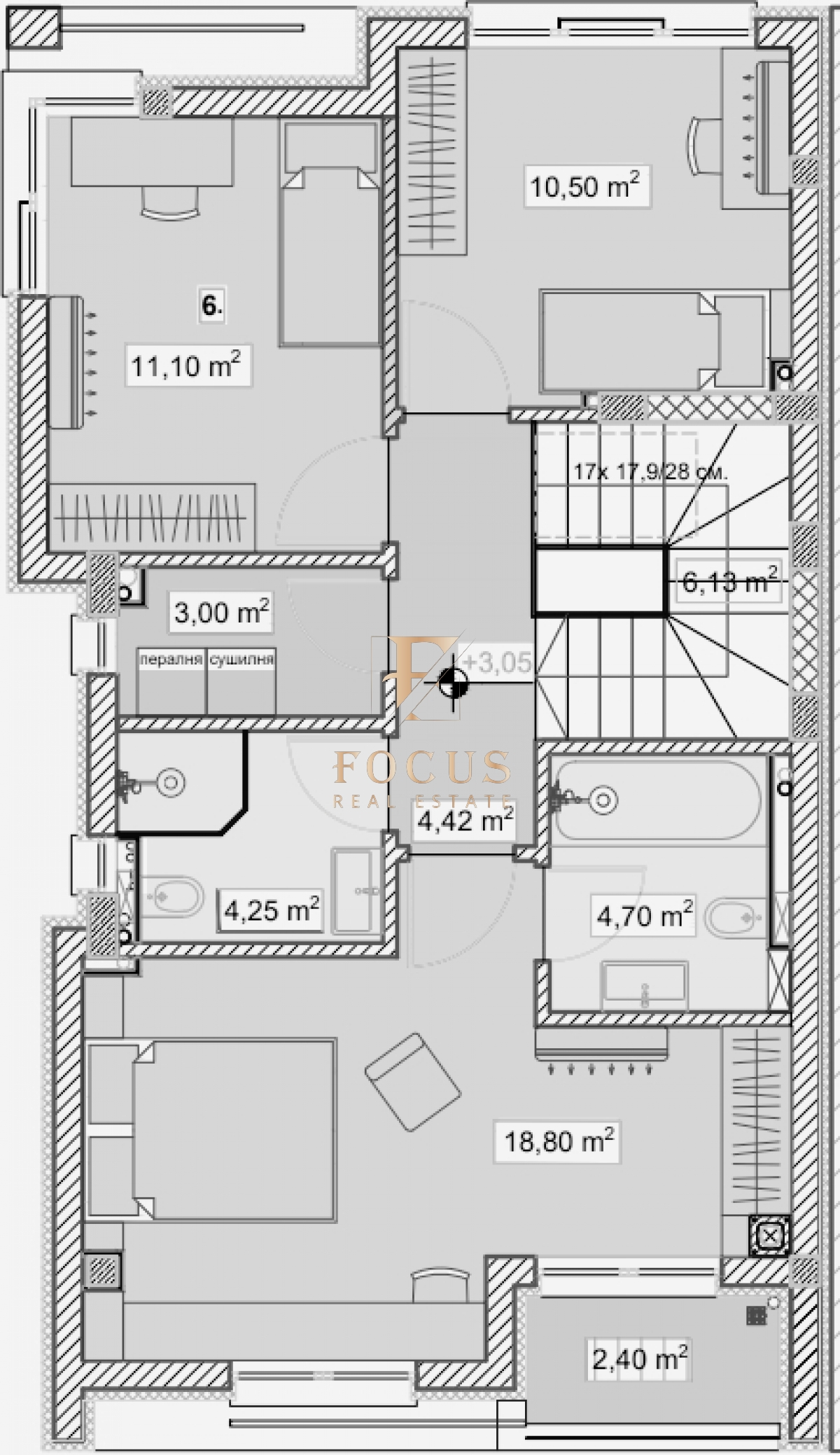Втори етаж: коридор, три спални, две бани с тоалетни и балкон.