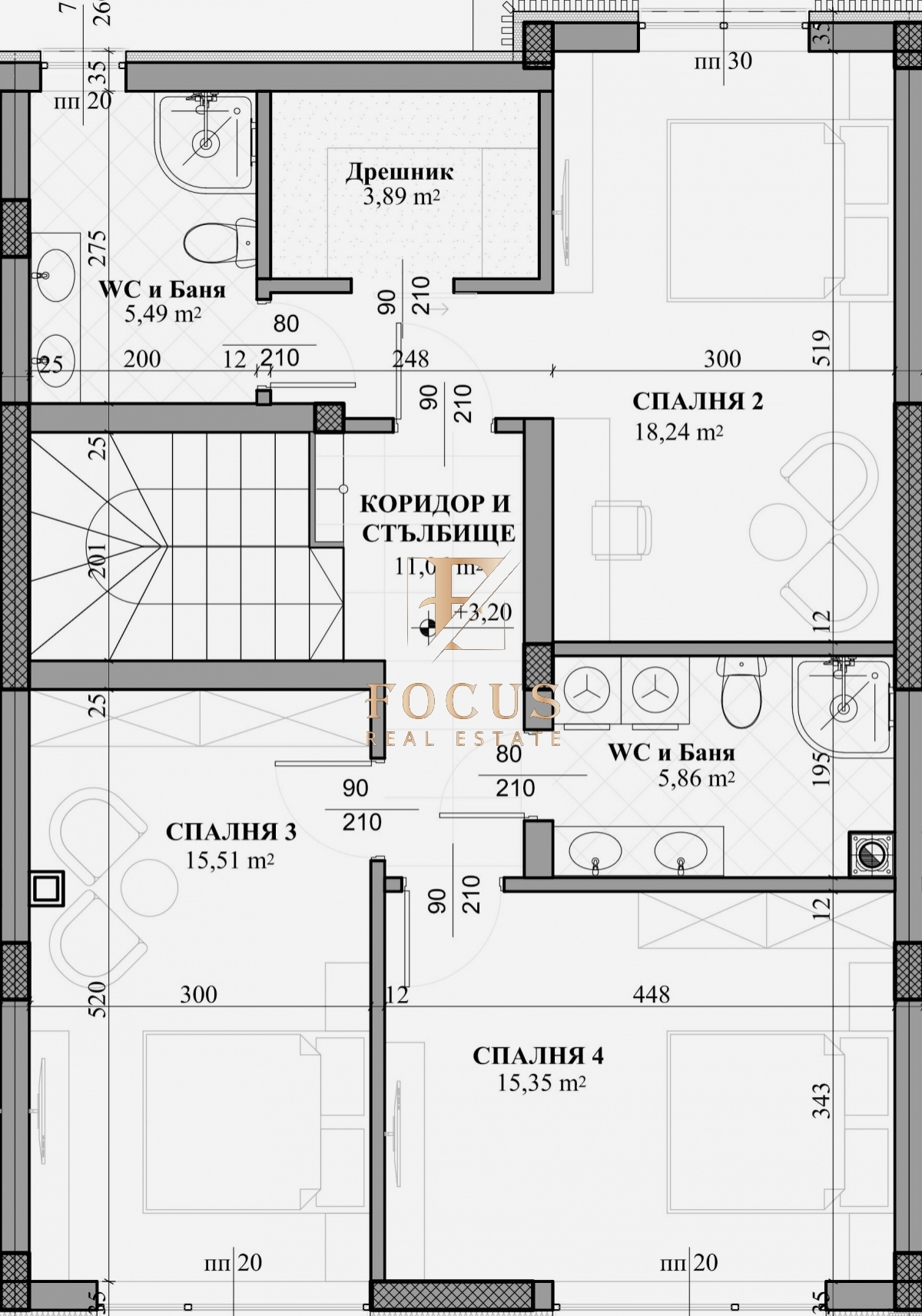 – втори етаж: коридор, три спални, две бани с тоалетни, дрешник, мокро помещение и две тераси.