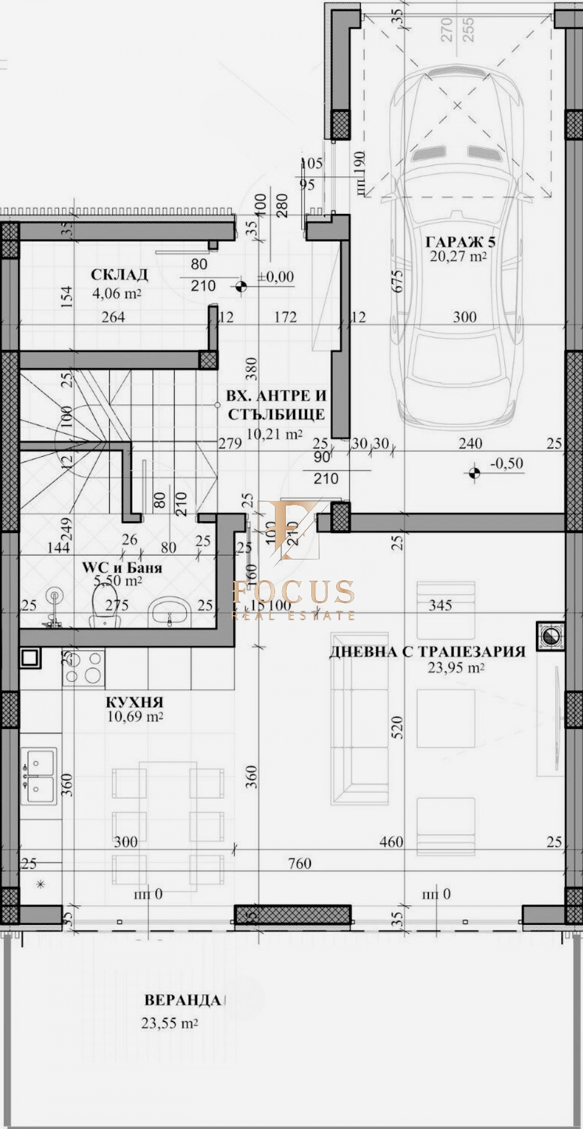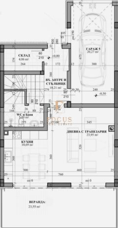 – първи етаж: антре, дневна с трапезария, кухненски бокс, баня с тоалетна, склад, гараж с топла връзка, веранда – 23,55 кв.м.