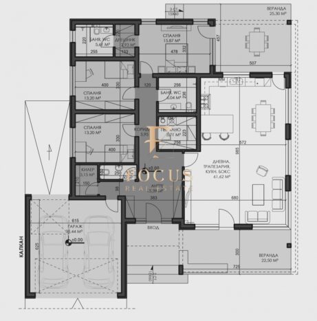 Къщата е с обща квадратура 254,85 кв.м. като има следното разпределение: антре, дневна с кухненски бокс, три спални, дрешник, две бани с тоалетни, отделна тоалетна, мокро помещение, килер, две веранди и голям гараж с топла връзка.