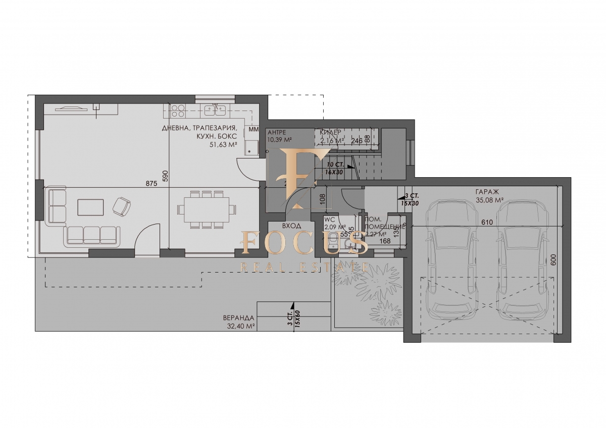 – първи етаж – голям гараж с топла връзка, сервизно помещение, антре, хол с кухненски бокс, тоалетна и веранда – 139,77 кв.м.;