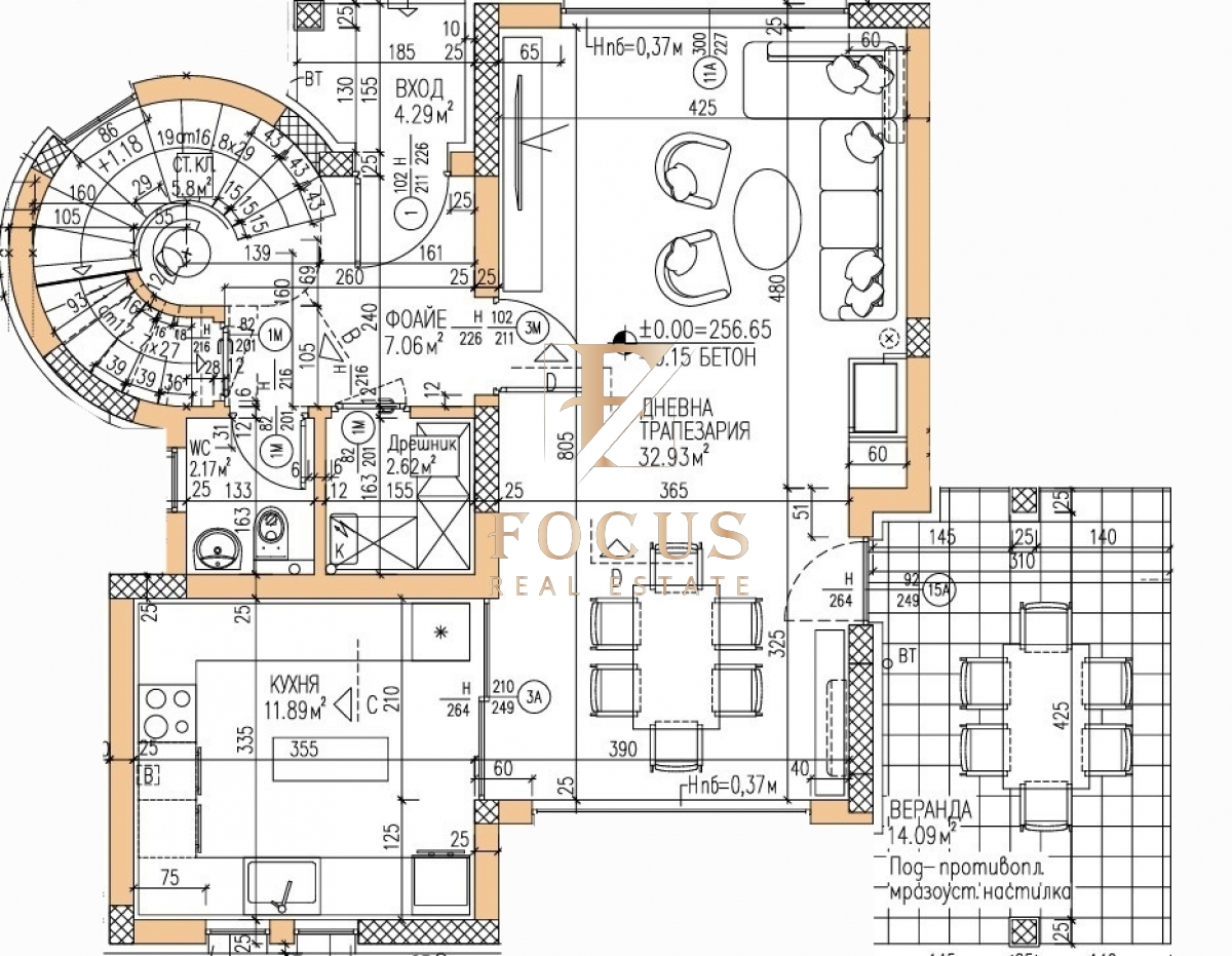 Първи етаж: антре, просторна дневна с трапезария и кухненски бокс, баня с тоалетна, дрешник, двоен гараж с топла връзка и веранда – 14,09 кв.м.