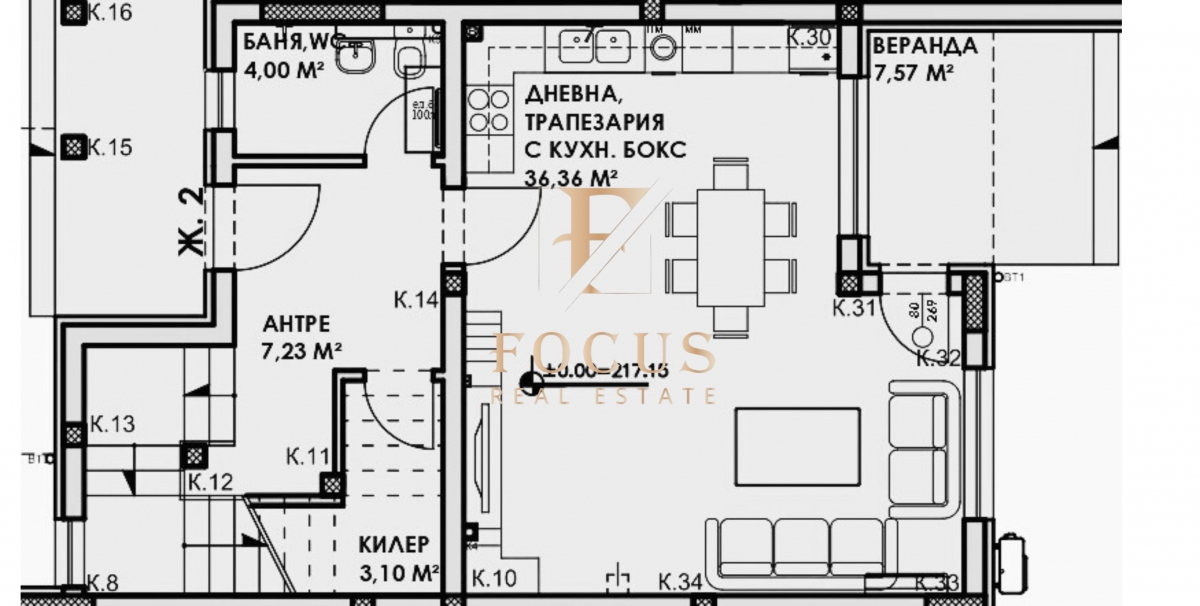 1-ви етаж: антре, просторна дневна с кухненски бокс, баня с тоалетна, склад и веранда – 7,57 кв.м.