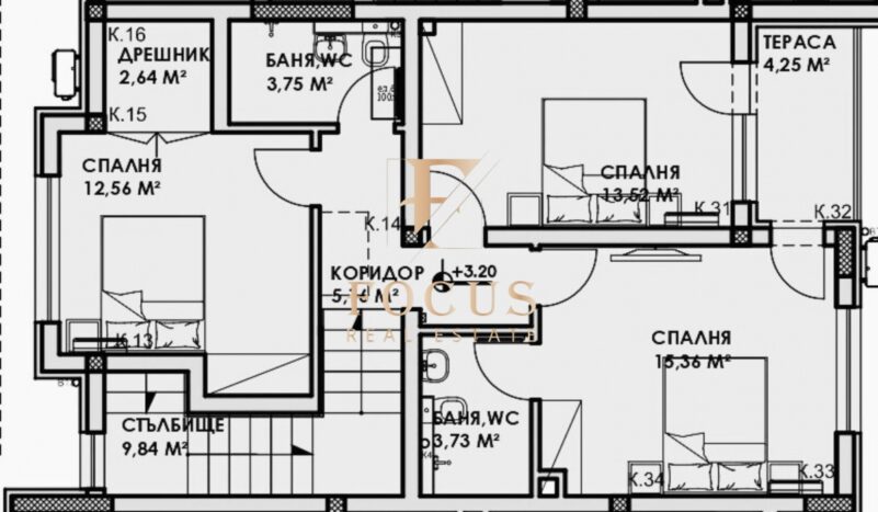 2-ри етаж: три спални, дрешник, две бани с тоалетни, мокро помещение и тераса.