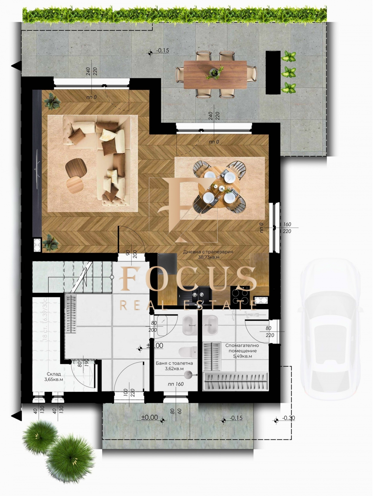1-ви етаж – антре, дневна с кухненски бокс, баня с тоалетна, спомагателно помещение, склад и веранда;