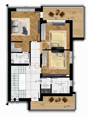 2-ри етаж: антре, три спални, две бани с тоалетни, гардеробна, мокро помещение и две тераси.