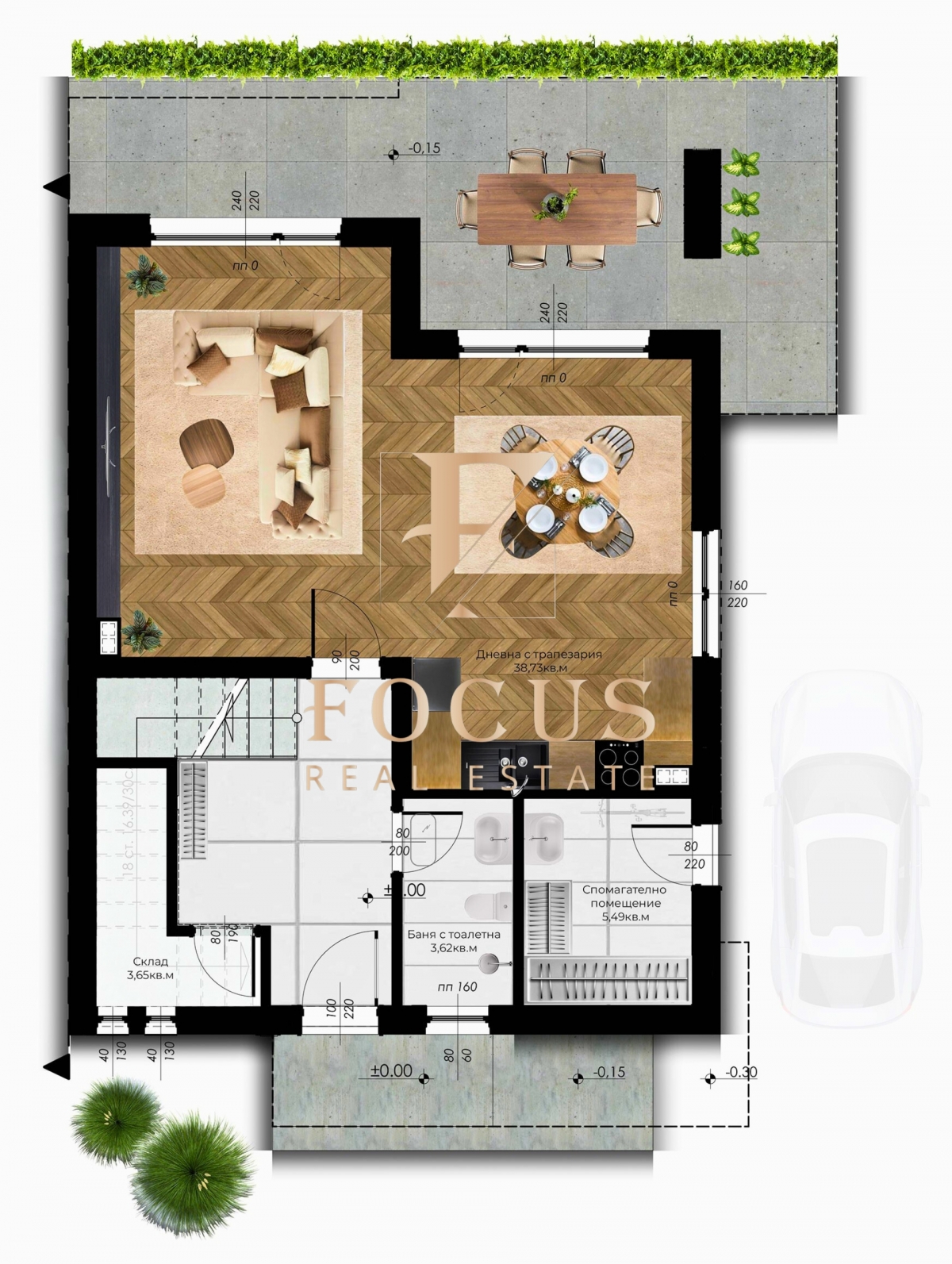 1-ви етаж: антре, просторна дневна с кухненски бокс, баня с тоалетна, спомагателно помещение, склад и веранда;