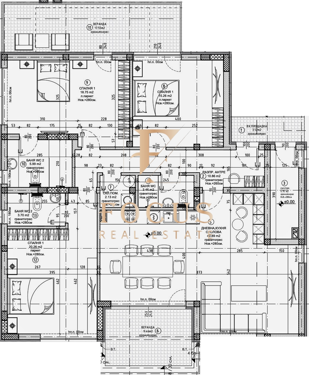 Къщата е с обща площ от 180 кв.м. и е със следното разпределение: