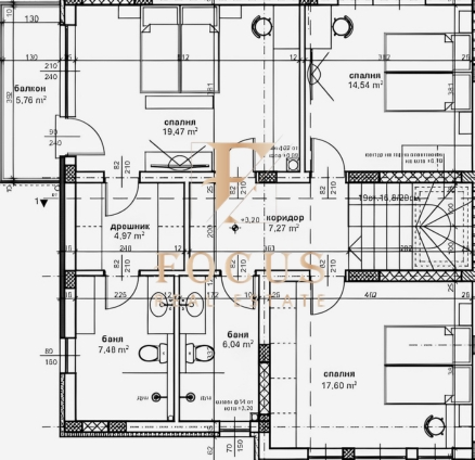Втори етаж: коридор, три спални, дрешник, две бани с тоалетни и балкон.