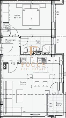 Апартаментът е с обща площ от 65,14 кв.м. със следното разпределение: антре, хол с кухненски бокс, спалня, баня с тоалетна и тераса.