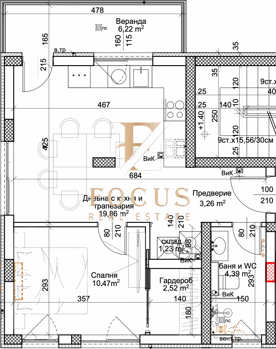 Апартаментът е с обща площ от 107.31 кв.м. със следното разпределение: антре, хол с кухненски бокс, спалня с гардеробна, баня с тоалетна и веранда – 6.22 кв.м. Към апартамента има двор 35 кв.м.