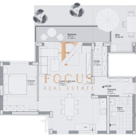 Апартаментът е с обща площ от 114,65 кв.м. със следното разпределение: антре, хол с кухненски бокс, спалня, баня с тоалетна, склад и веранда – 8,27 кв.м. Към апартамента има двор 19,35 кв.м.