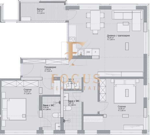 Апартаментът е с обща площ от 123.25 кв.м. със следното разпределение: антре, хол с кухненски бокс, две спални с гардеробни, две бани с тоалетни, склад и тераса.