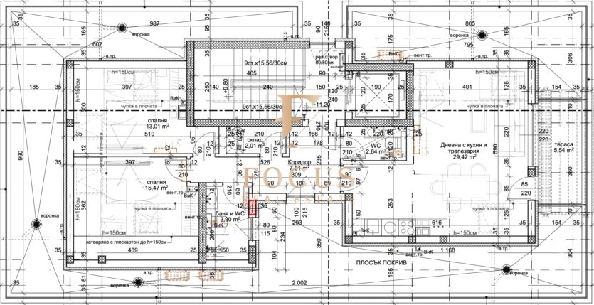 Апартаментът е с обща площ от 234,95 кв.м. със следното разпределение: антре, хол с кухненски бокс, две спални, баня с тоалетна, отделна тоалетна, склад и тераса – 104 кв.м.