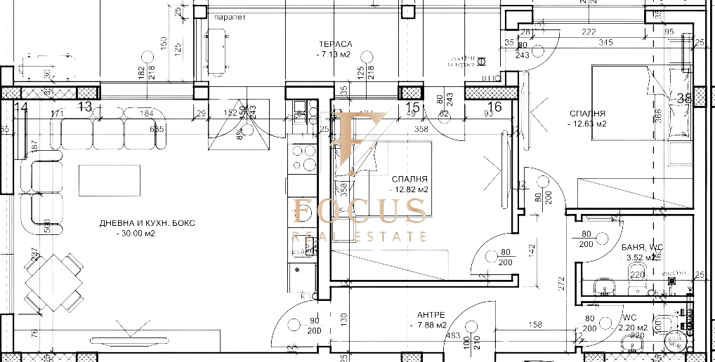 Разпределение: антре, дневна с кухненски бокс, две спални, баня с тоалетна, отделна тоалетна и тераса.