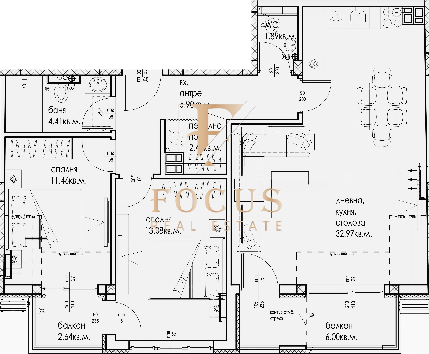 Разпределение: антре, дневна с кухненски бокс, две спални, баня с тоалетна, отделна тоалетна, перално помещение и две тераси.