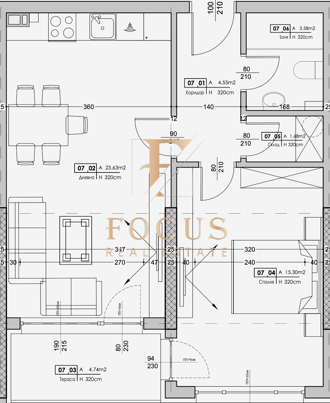 Апартаментът е с обща площ от 71,58 кв.м. със следното развитие: антре, хол с кухненски бокс, спалня, баня с тоалетна, склад и тераса.